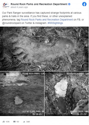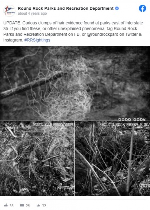 In June of 2017, the Round Rock Texas Department of Parks and Recreation decided to start a publicity campaign to get more people to visit the parks, so they 'created' evidence of Bigfoot to entice them. It was all a publicity stunt, but will forever be known by the Bigfoot community as a major hoax and will likely pop up every so often in the future by those who don't know the history of this event.
