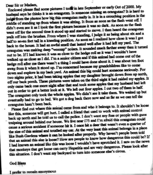 The Myakka Ape is the name given to a figure, with an appearance similar to an orangutan, that was supposedly photographed by an anonymous resident from Sarasota, Florida and sent to the Sarasota Sheriff's Department on December 22, 2000 along with a letter. Some believe this is Florida's skunk ape, a biped cousin of Bigfoot, while others think it is actually a real orangutan, and yet others are wholly convinced that it is a clever hoax. The images and letter remain much discussed and debated in part because they contain a mixture of seemingly realistic elements along with some inherent problems.