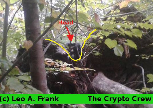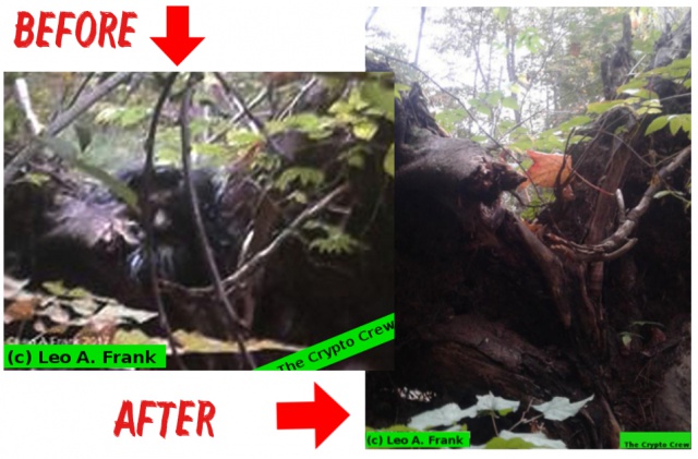 The original picture above shows a bigfoot looking between a "V" shaped pattern on a root ball. The subject, according to Leo, is 7 foot tall. It would be easy to get a good estimate of the height based on the size of this root ball. Leo would know the approximate height of it, as he has spend many hours here. So, I would think his estimate of 7 foot tall is accurate.