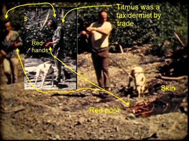 I can’t think up any time line that could make sense and haven’t encountered anyone else’s explanation of it. It appears that I am supposed to have heard of the massacre somehow and taken the tracking dog to try to find the site, then having found it having joined in the conspiracy to cover it up. That would get me there while there was still red blood all around, but would have to be after the actual shooting and before Patterson and Gimlin buried anything–but Patterson’s movie has to have been made after the burying to raise the level of the ground.
