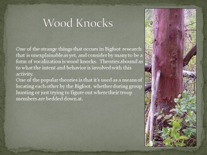 Tree knocking, or wood knocking, is another sound attributed to bigfoot. The sound is believed to be made by a bigfoot striking a tree or log with a large stick, and does not originate from within the creature itself, like a vocalization.